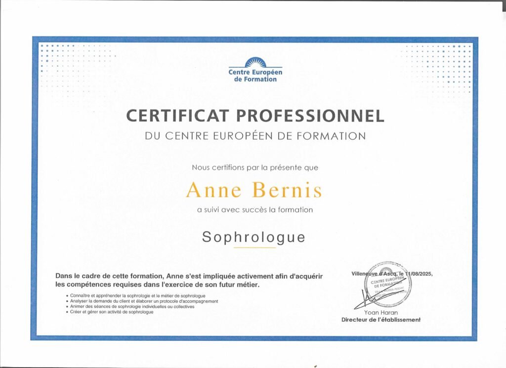 Ma reconversion professionnelle en sophrologie s’est donc imposée comme une évidence. Elle réunit mes valeurs et mes convictions (la bienveillance, le respect, l’autonomie, mon goût pour l’accompagnement et l’importance d’harmoniser le corps et l’esprit). Elle me permet aujourd’hui de proposer un espace dans lequel chacun peut trouver les outils nécessaires pour mieux gérer le stress, développer ses ressources personnelles et avancer plus sereinement dans sa vie.